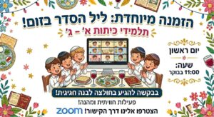 בְּ10:15 מִפְגַּשׁ תְּפִלָּה . [לַחֲצוּ עַל הָרִיבּוּעַ מִיָּמִין.]בְּ11:00 מִפְגַּשׁ ליל הסדר שכבתי . [לַחֲצוּ עַל הָרִיבּוּעַ מִיָּמִין.]
